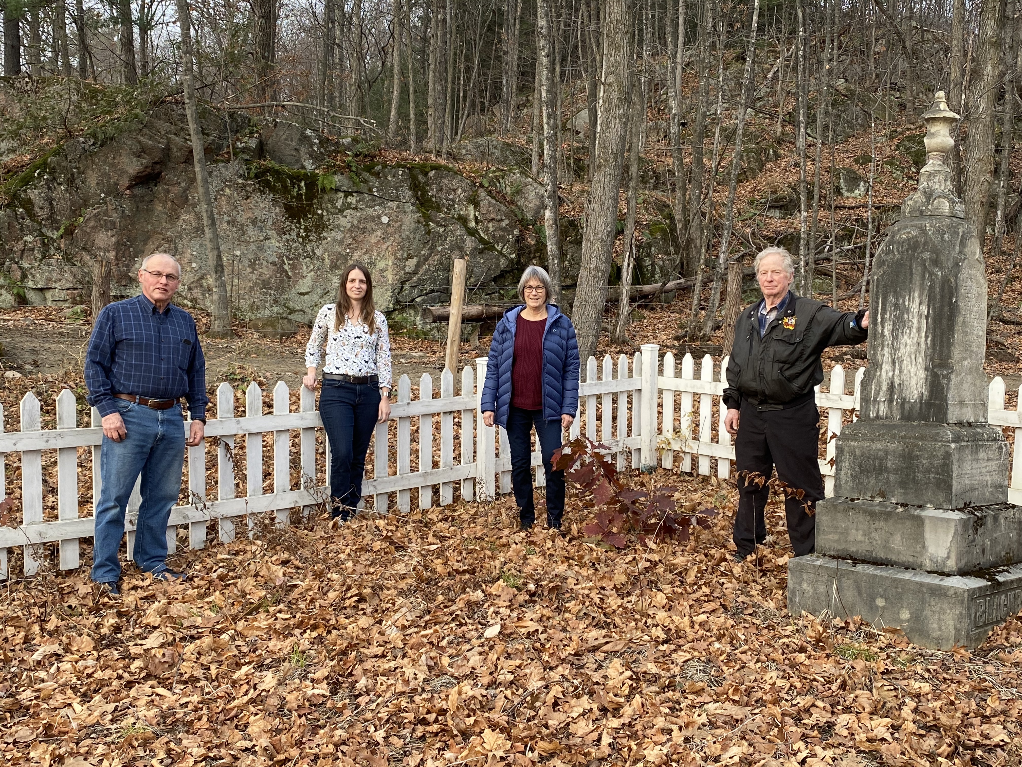 Members of the pioneer cemetery committee in Cantley stand inside the Blackburn family burial ground, situated in the Gatineau River valley. With support from the Belonging initiative, the local history group, Cantley 1889, is going to erect a historical marker here to promote awareness of the community's early settlement history. (L-R) Bob McClelland, Valérie Crevier, Margaret Phillips and Gary Blackburn.